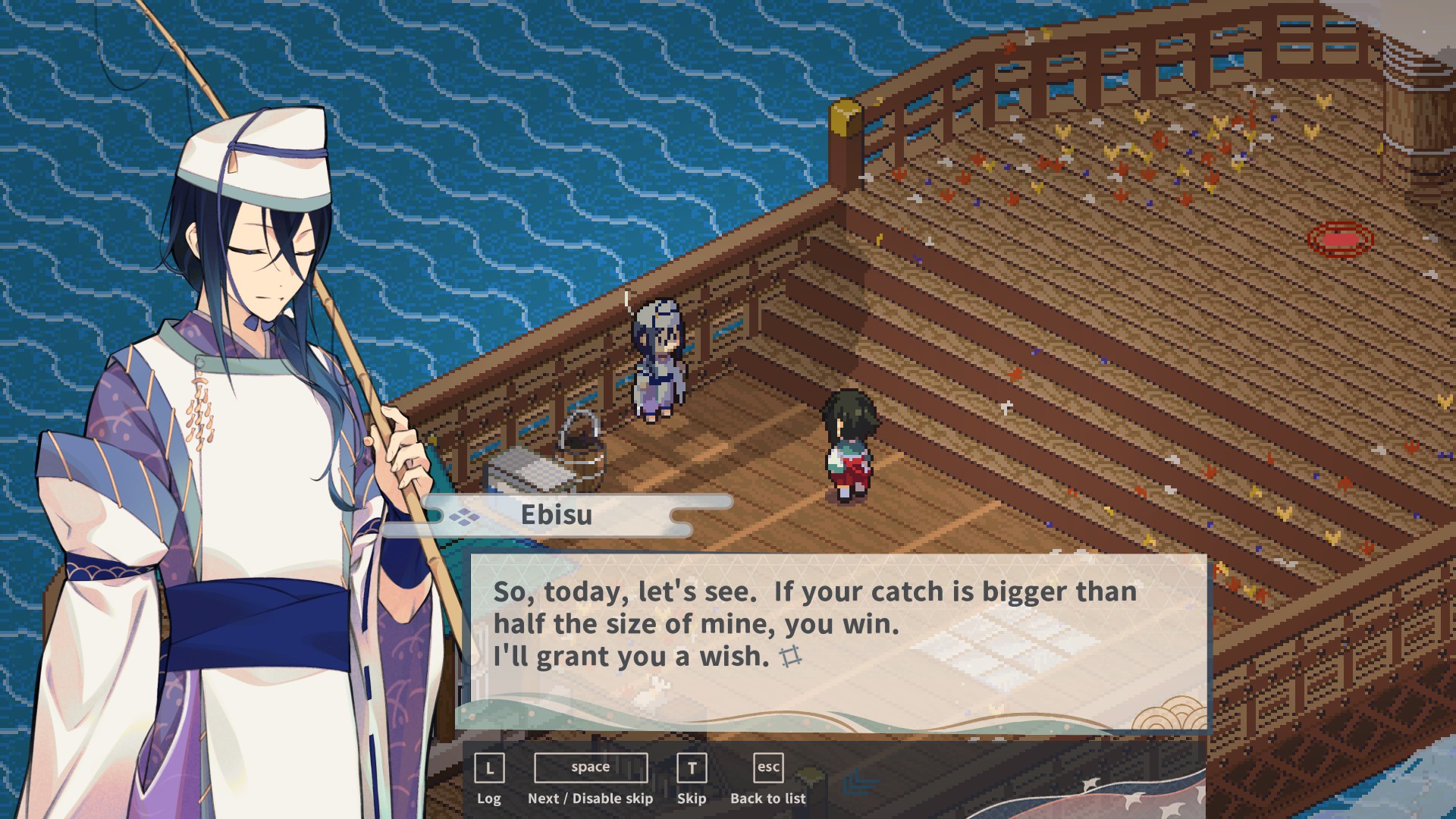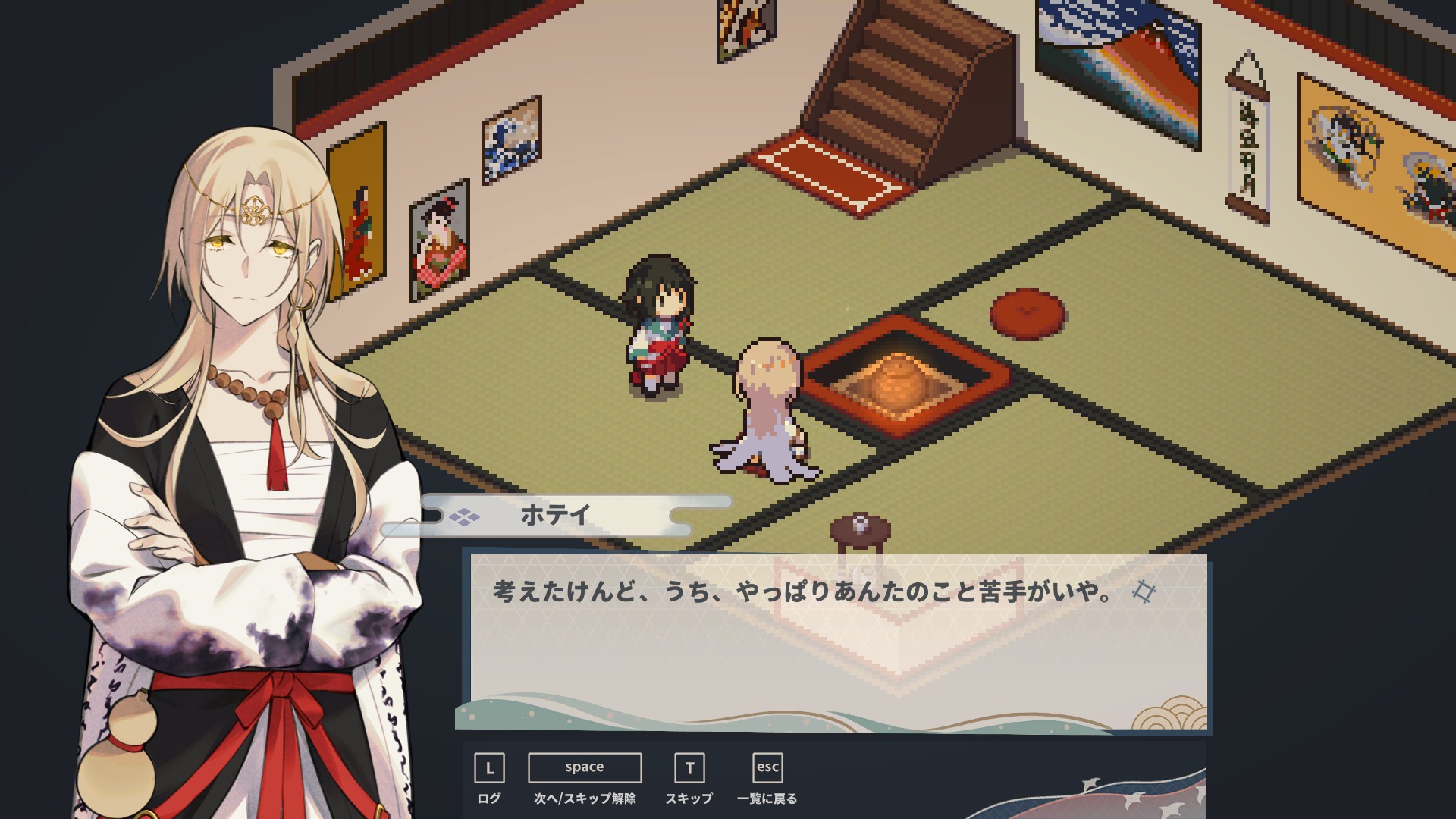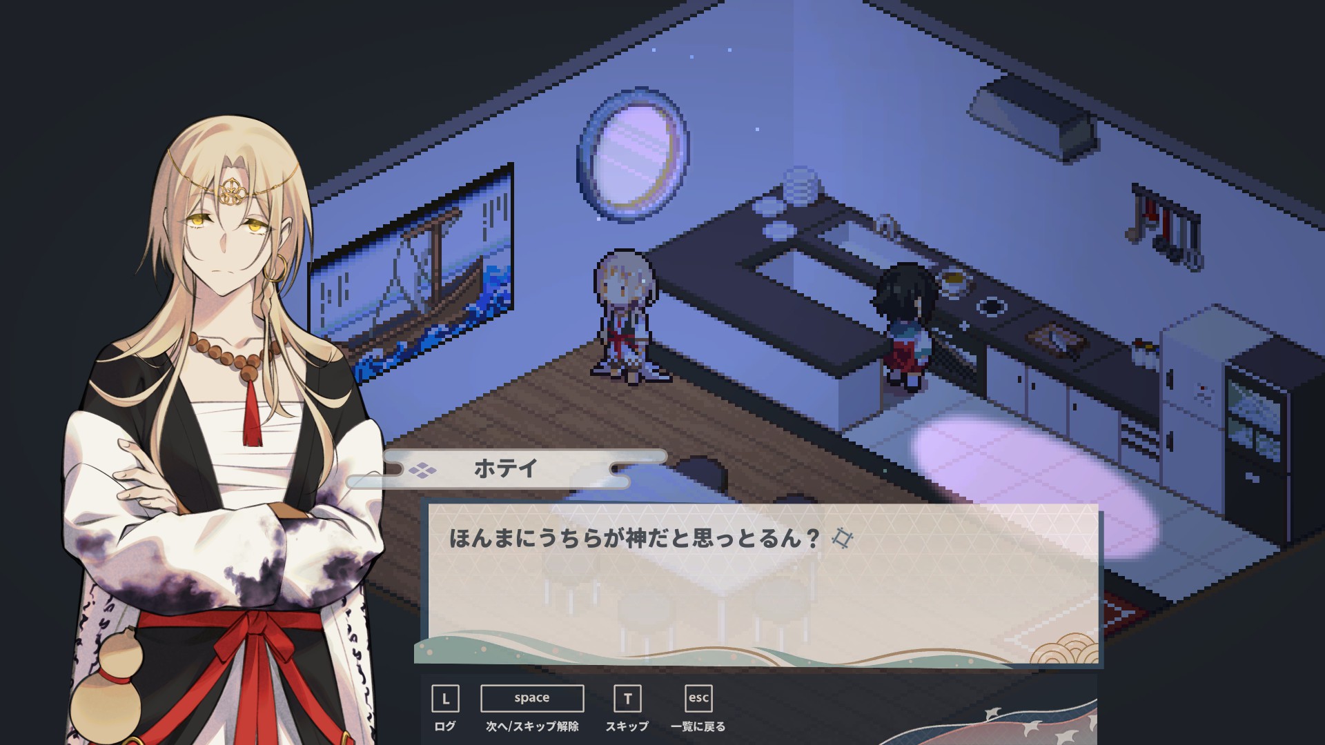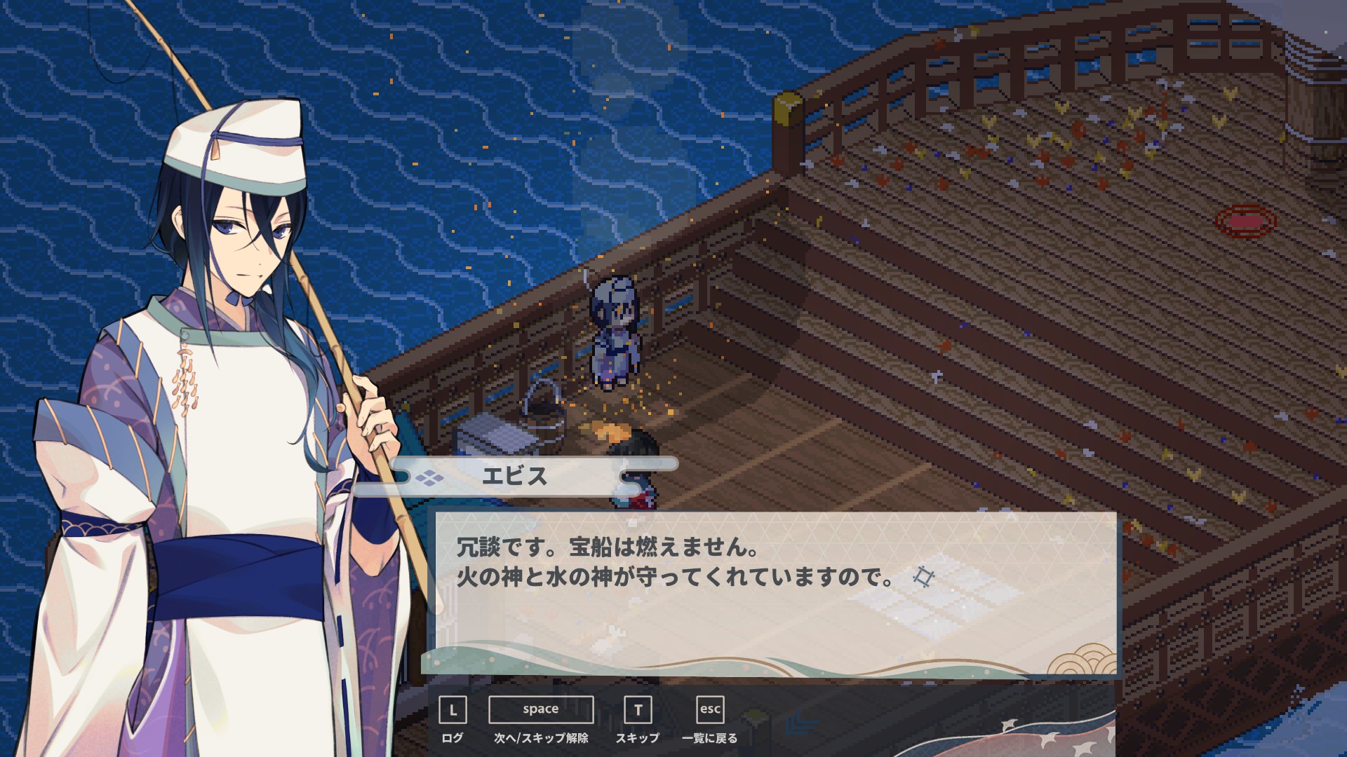 七福神を翻弄する和風ドット絵アドベンチャーゲーム「虹の降る海」は数々のユニークな逸話を持つ七福神をモチーフにした物語です。クォータービューのドット絵で表現された宝船内を移動してキャラクターと交流し、イベントを発生させます。ただの人間であるあなたが神さまと渡り合うための唯一の武器は嘘をつくことです。自分の選択や行動が細かく反映された結果として辿り着く22のエンディングは全く異なるもので、数々の散りばめられた伏線を目にしたプレイヤーであるあなただけがすべての真実を知ることになります。 // You can play with the Seven Lucky Gods, the Japanese popular and traditional gods for the ordinary folks, in the Japanese-style pixel-art adventure game Rainbow Sea. As a mere mortal, Human, your only weapon to cross paths with the gods is to lie. The twenty two endings you will reach as a result of your choices and actions are completely different, and only you, the player, will know the truth of everything after seeing the numerous foreshadowing lines.